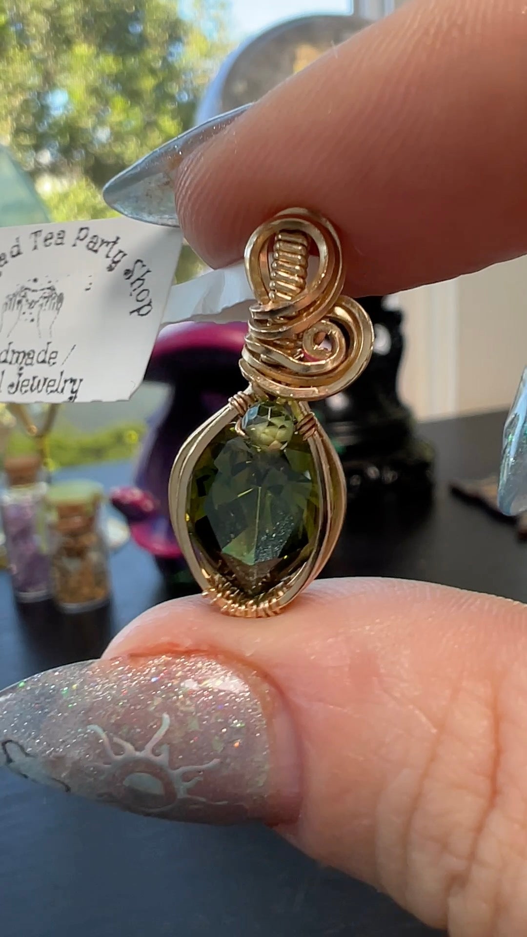 Elevate your style with this Olive Green Cubic Zirconia Pendant, elegantly handcrafted in 14k gold-filled wire with graceful swirls and a matching accent bead for added charm. Its vibrant olive green hue radiates elegance, making it a timeless piece for everyday wear or special occasions.